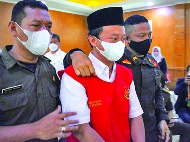 عالمی خبر رساں ادارے کے مطابق انڈونیشیا کے صوبے جاوا کی عدالت نے بورڈنگ اسکول میں غریب طالبات کو 2011 سے 2016 کے درمیان لالچ یا ڈرا دھمکا کر 11 سے 16 سال کی 13 طالبات کو جنسی زیادتی کا نشانہ بنانے والے استاد کو عمر قید کی سزا سنائی ہے۔