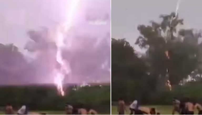 کھیل کے دوران اچانک درختوں پر آسمانی بجلی گری جس کے بعد کھلاڑی اپنی جان بچانے کیلئے بھاگ پڑے۔
